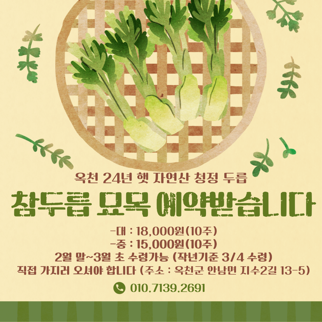 두릅 예약 안내입니다.라파공동체2026.03.28 15:232 안녕하세요. 현재 참두릅 묘목 예약만 받습니다. 가시두릅에 관심있으신 분들은 010-7139-2691로 연락주세요. 현재 라파공동체에서는 양계, 곶감, 꾸지뽕, 두릅을 하고있습니다. 봄이되어 두릅순이 올라오면 또 공지하겠습니다. 많은 관심 부탁드립니다. 감사합니다.